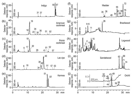Chromatogram of Polynesian indigo (a), American cochineal (b), Polish cochineal (c), lac dye (d), kermes (e), madder (f), brazilwood (g), logwood (h), sandalwood (i), and orchil (j) extracts acquired by UV-Vis detector; peak numbers are decoded in Table 1.