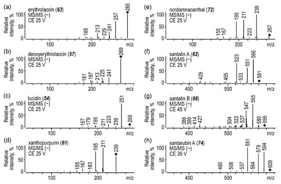 MS/MS spectra of (a) erythrolaccin, (b) deoxyerythrolaccin, (c) lucidin, (d) xanthopurpurin, (e) nordamnacanthal, (f) santalin A, (g) santalin B, and (h) santarubin A acquired in negative ion mode.