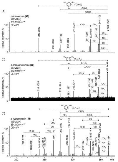 High resolution MS/MS spectra acquired in positive ion mode for α-aminoorcein (a), α-aminoorceinimine (b), and α-hydroxyorcein (c).