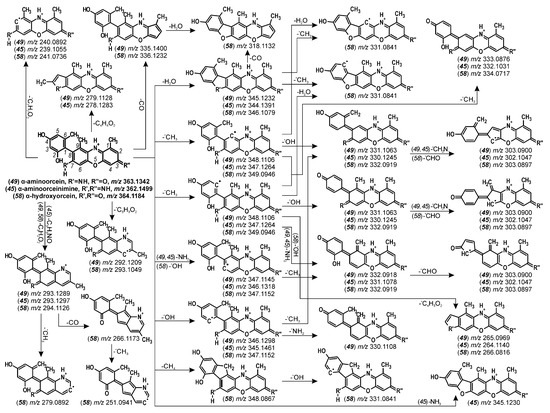 Proposed fragmentation pathways for α-aminoorcein (49), α-aminoorceinimine (45), and α-hydroxyorcein (58).