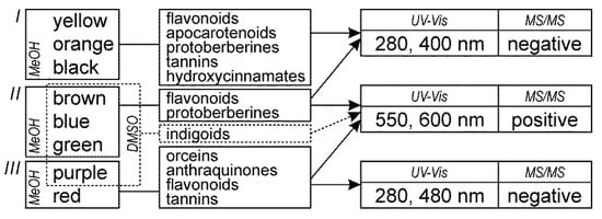 Most HPLC methods published to date have been dedicated to identifying specific groups of colorants, such as anthraquinones from madder and scale insects [7,8,9,10,11,14,17,18,19,20,21,22,30,31] or indigoids [5,7,8,9,11,12,13,14,15,16,20,21,32], whereas only one was about orchil colorants [33,34,35]. However, it appears that there are no reports devoted to sandalwood colorants. Additionally, not all brazilwood markers have been identified yet, despite recent successes in this field [36]. Furthermore, to the best of our knowledge, there is no publication on a universal analytical approach discussing dozens of colorants, as opposed to being limited to just selected and the most popular compounds or their groups.