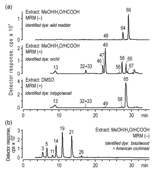 High-performance liquid chromatography (HPLC) is the most common technique used for the separation of colorants present in natural dyes and historical textiles [1,2,3]. Since the amount of available research material is usually limited, it is extremely important to use a sensitive detector that is both selective and versatile for a variety of coloring compounds. Thus, the best results are acquired using both spectrophotometric (UV-Vis) and mass spectrometric (MS) detection together [4,5,6,7,8,9,10,11,12,13]; however, they are used individually as well [14,15,16,17,18,19,20,21,22].
