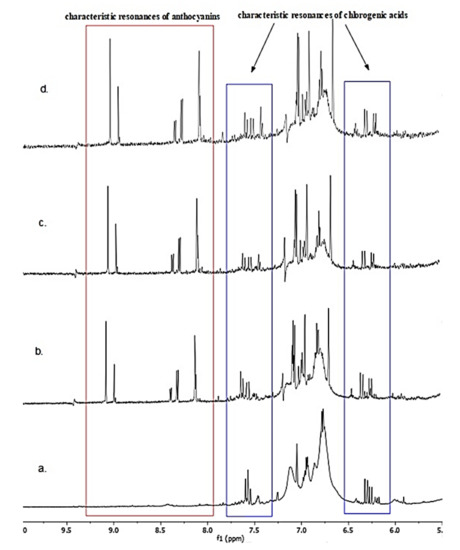 1H-NMR spectra of fruit samples from farm 1-LS (aromatic area from 5.5 to 10.0 ppm with diagnostic signals for anthocyanins (red frame) and chlorogenic acid (blue frame)): (a) LS1, (b) LS6, (c) LS9, (d) LS11.