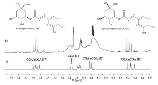 1H-NMR spectra of the mix chlorogenic acid and neochlorogenic acid (a) and for green fruit extract (b) with diagnostic signals, H5′, H2′, H7′, and H8′, respectively.