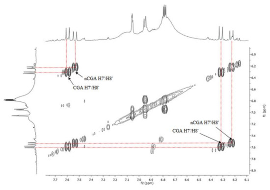 1H-1H COSY NMR spectrum for the green fruit extract showing H7′/H8′ correlations for CGA and nCGA.