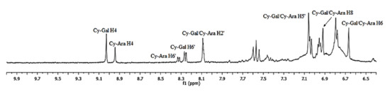 1H-NMR chemical shifts (δ, ppm) for cyanidin galactoside (Cy-Gal) and cyanidin arabinoside (Cy-Ara) in MeOD-d4.