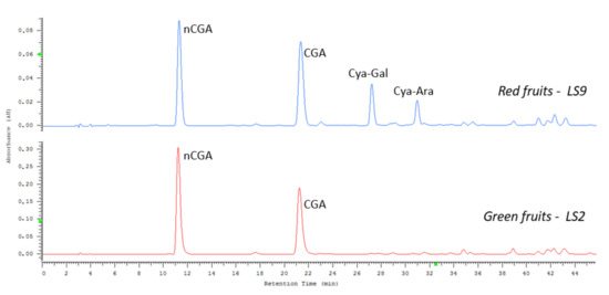 The HPLC analysis allowed tracking of the changes in the profile of compounds during fruit ripening. Figure 7 shows a chromatogram registered at 330 nm, for the extracts from green and red fruits. The extract from June (LS2) contains only neo- and chlorogenic acids, whereas anthocyanins are visible in the chromatogram of red fruits (LS9, August).