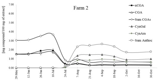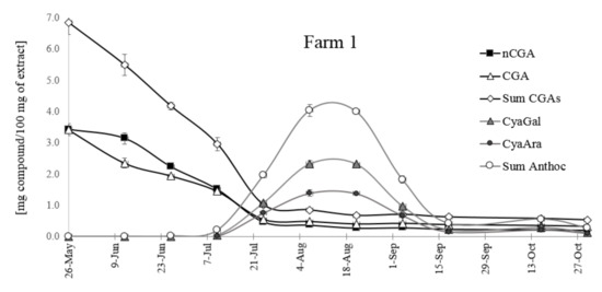 The differences in the pattern of changes in the anthocyanin content for both farms are also visible. The level of anthocyanins in fruits growing in the mild climate of central Poland increased until mid-August, up to ca. 4 mg/100 g of the extract, and then it decreased. The optimum time for harvesting anthocyanin-rich fruits is between 4-August and 18-August. The fruits from farm 2 located at a higher altitude accumulate less anthocyanins (below 3 mg/100g of the extract), but the decrease of their content is slower. The harvesting period is longer, from 7-August to 18-September, and overripe fruits collected at the end of October still contain ca. 2 mg of anthocyanins per 100 g of the extract. It is interesting to note that the time of CGAs reduction correlates with the appearance of anthocyanins.