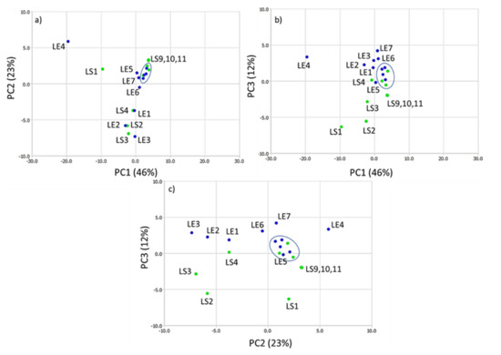 Each PC plot shows that ripe fruits (circled on the plots) have lower internal group variance than the variance for unripe fruits. The points are separated mainly among PC1 (plot a and b) and PC3 (plot c). The samples from the farm in central Poland (green points) from 24-July (LS5) to 4-September (LS8) have lower group variance. They are clustered on the plots with samples LE8–LE11 (blue points, 4-Sepember–30-October). This group corresponds to ripe fruits in the harvest time and is circled on each plot. Based on PCA scores analysis, it seemed that the fruits from central Poland (farm 1) need less time to reach the composition of bioactive compounds typical of ripe fruits.