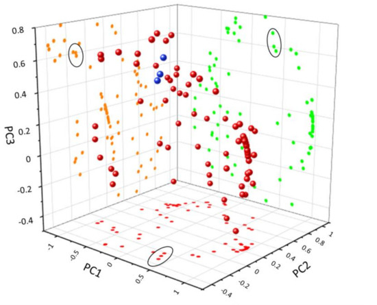 Loading plots based on PC1, PC2, and PC3 components; blue spheres and circled points refer to chemical shifts of anthocyanins.