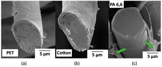Scanning electron microscopy (SEM) images of (a) poly(ethylene terephthalate) (PET), (b) cotton, and (c) nylon 6,6 (PA 6,6) single fibers coated with nanofibrillated cellulose (NFC). Arrows point to the peeled fraction of the NFC coating.