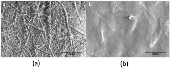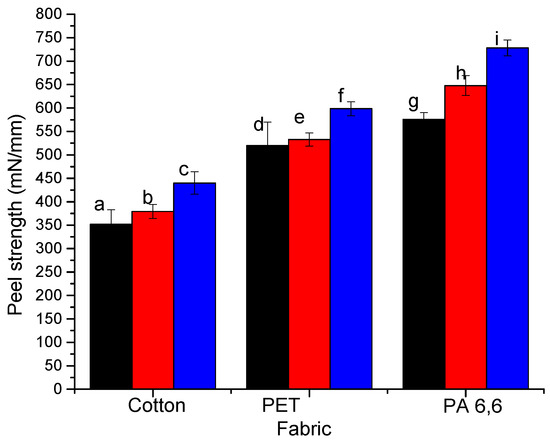 This hypothesis was verified with the analysis of the structure and porosity of the fabrics. The warp and weft density and mean flow pore diameter (MFPD) of the fabrics are presented in Table 2. The result indicates that warp and weft density for cotton fabrics are substantially higher than those for other samples. While warp densities between polyester, nylon, and cotton/polyester are similar, the weft density of nylon is the lowest among the samples. Fabrics with higher weft density are less permeable for functional additives [56]. This structural property explains the highest peel strength for nylon and the lowest for the cotton fabrics.