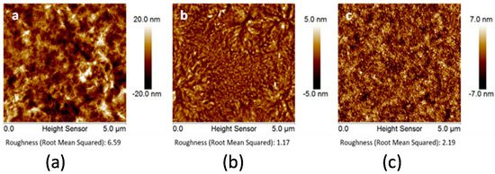 Representative atomic force microscopy (AFM) images of about 50–180 nm thick spin-coated films of (a) cellulose (CL), root mean square (RMS) roughness is 6.59 nm; (b) nylon, RMS roughness is 1.17 nm; and (c) PET, RMS roughness is 2.19 nm on the surface of the Si-wafers.