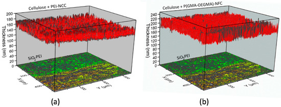 Representative examples of 3D-plots of layer-by-layer ellipsometric mapping of nanocellulose films on the polymer-coated Si-wafers constituted of the layers: (a) native SiO2 (1 nm), poly(ethylene imine) (PEI) (1 nm), cellulose film (150 nm), PEI (1 nm), and NCC (20 nm); (b) native SiO2 (1 nm), PEI (1 nm), CL (180 nm), PEI (1 nm), and NFC-copolymer of glycidyl methacrylate (GMA) and oligo(ethylene glycol) methacrylate (OEGMA) (P(GMA-OEGMA)) mixture (40 nm).