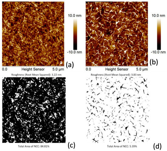 AFM images NCC coatings on PET as-deposited (a,c) and after rinsing in water (b,d): topography images (a,b) and flooding analysis images showing the surface coverage by NCC particles (c,d).