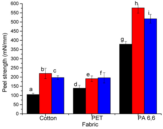 Peel strength for cotton, PET, and PA 6,6 fabrics adhered using NFC: (a,d,g) NFC with no additives, (b,e,h) NFC+PEI, and (c,f,i) NFC+P(GMA-OEGMA) mixtures.