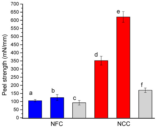 Peel strength for polymer films made of cellophane, PET, and PA 6,6 adhered with (a,c,e) NFC and (b,d,f) NCC.