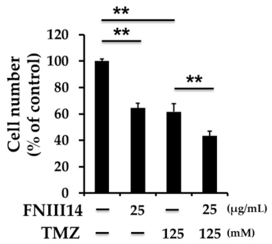 - Iyoda, T.; Nagamine, Y.; Nakane, Y.; Tokita, Y.; Akari, S.; Otsuka, K.; Fujita, M.; Itagaki, K.; Takizawa, Y.-I.; Orita, H.; et al. Coadministration of the FNIII14 Peptide Synergistically Augments the Anti-Cancer Activity of Chemotherapeutic Drugs by Activating Pro-Apoptotic Bim. PLoS ONE 2016, 11, e0162525. [Google Scholar] [CrossRef]