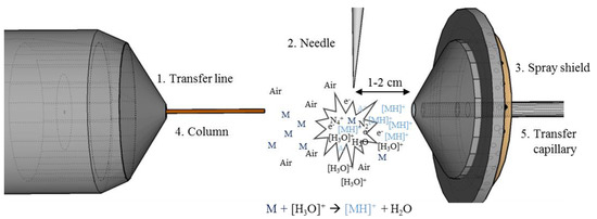 Overview of a conventional gas chromatography-atmospheric pressure chemical ionization-mass spectrometry (GC-APCI-MS) set up. The system contains the transfer line (1), the APCI corona needle (2), spray shield (3), the GC column (4), and a transfer capillary (5). The needle is mounted 1–2 cm from the interface system. Between the needle and the inlet system is the plasma zone, where the reaction cascade take place.