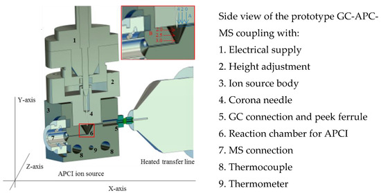 In conventional GC-APCI setups, the corona needle is positioned in front of the MS entrance and a heated transfer line is guided from the GC side wall to the mass spectrometer entrance. This source chamber design is equipped with an exit port for the excessive gas flows from the mass spectrometer (e.g., drying or curtain gas). This leads to a high background, unstable ion source conditions, and poor repeatability [13]. Therefore, the presented closed ion source design from Kersten et al. was adapted and optimized for GC-APCI [18]. The schematic drawing of the developed ion source is shown in Figure 2. It includes the experimental set up for the variation of the needle height (B, variation in Y-axis) and the possible variation of the column position (A, variation in x-axis). The developed protype ion source housing is made of stainless steel with a size of 4 × 4 × 4 cm (3). The metal cube holds the APCI needle (4) and high voltage connector (1), which are taken from the commercially available GC-APCI ion source (Agilent Technologies, Santa Clara, CA, USA) and are made from stainless steel and PEEK. The height of the APCI needle can adjusted over the self-constructed needle holder (2) made from PEEK. The GC column was introduced over an opening (5) and closed via a PEEK ferrule. The metal block is temperature regulated over an electrical isolated thermocouple (8–9) and can adjusted between 70 and 300 °C. The reaction chamber for the APCI process (6) had a total volume of 0.12 cm3 and is approximately 1000 times smaller than conventional GC-APCI ion sources from commercial manufactures. The ion source body (3) can be directly connected to the transfer capillary (7) of the 6495 triple quadrupole LC/MS and GC (5), both from Agilent Technologies (Santa Clara, USA).