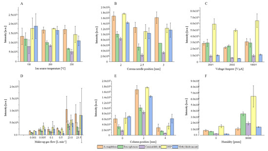 To investigate the ionization behavior in this source chamber, important parameters such as temperature (°C), make-up gas flow rate (L min−1), column position (mm), needle position (mm), the humidity in the make-up gas flow (water concentration in the gas in ppm (v/v)) and corona discharge parameters, such as corona needle voltage (V) and corresponding ionization current (µA), were varied. For this, different compound classes that are frequently analyzed by GC were used [37,38]. The above-mentioned ion source parameters and their influence on ion yield and transmission are summarized in Figure 3 A–F. The figure shows variation of the peak height (Intensity (a.u.)) in relation to one of the adjusted parameters.
