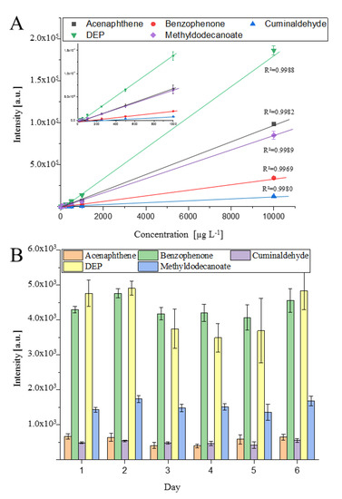 Over six days, only marginal shifts in the peak height were obtained. The averaged peak intensity of each day showed a normal distribution around the averaged peak intensity over the six days and an RSD for the interday repeatability <15% was obtained for all compounds, except DEP. On average, an intraday repeatability with RSD values <10% was obtained. Only at day 5 of the series of measurements did higher standard derivations of approximately 20% occur. Normally, RSD values <7% were obtained as seen by the calibration curve in Figure 4A. The RSD values were for each concentration and analyte were < 7%. A linear relationship between the peak height and the concentration was found between 10 and 10,000 µg L−1 with a correlation coefficient of R2 >0.997. No detector saturation was observed, and a greater linear range can be expected for these compounds.