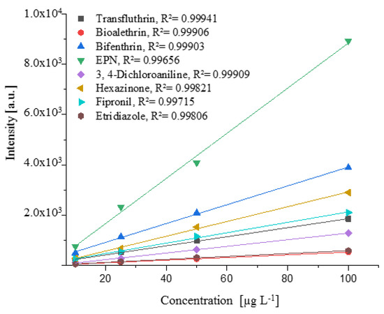 The linearity was investigated between 10 and 100 µg L−1 and was demonstrated for organophosphorus, organonitrogen, herbicide methyl esters, and synthetic pyrethroid in Figure 5.