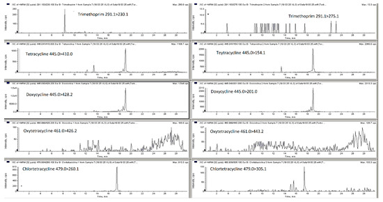 LC-MS/MS MRM chromatograms of spiked pig feces sample with all analyzed compounds at first validation level (trimethoprim—25 µg/kg; oxytetracycline, tetracycline, chlortetracycline, doxycycline, tylosin, tiamulin—100 µg/kg; lincomycin—125 µg/kg; enrofloxacin, ciprofloxacin—50 µg/kg).