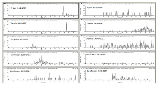 The mobile phase optimization was necessary to obtain satisfactory response for the different compounds at the different concentration levels and for each type of matrix selected (poultry and pig feces, liquid manure and digestate). For the analysis of antibacterial substances from liquid manure, animal feces and soil matrices researchers have employed a mobile phase ammonium acetate, formic acid, ammonium formate in water combination with methanol or acetonitrile with or without formic acid, ammonium formate or ammonium acetate [1,2,18,22,23,24,25]. Thus, in this research elution was achieved with a gradient with 0.1% of formic acid in water and 0.1% of formic acid in acetonitrile, this mixture permitted obtaining satisfactory retention times and good peaks shape. The chromatography separation of the different classes of antibacterial from liquid manure or animal feces conducted by other researchers is usually performed employing C18 chromatographic columns such as Nucleosil C18 HD, Kinetex C18, Genesis C18 and ACQUITY UPLC BEH C18 [1,2,8,19,22,25,26]. In this particular work, three HPLC columns were compared a Phenomenex Kinetex C18 (100 × 2.6 mm, 5 μm), Agilent Zorbax Eclipse C18 (150 × 4.6 mm, 5 µm) and Phenomenex Luna C18 (150 × 4.6 mm, 5 µm). The Kinetex C18 column and mobile phase consisting of 0.1% formic acid in Milli-Q water and 0.1% formic acid in acetonitrile gave the best results (peak resolution and signal intensity) with an injection volume of 15 µL. Figure 1 and Figure 2 show MRM chromatograms of blank pig feces sample and pig feces sample spiked with all analyzed compounds at the first validation level (see Section 3.7). All samples were analyzed using liquid chromatography with a single and tandem mass spectrometer.