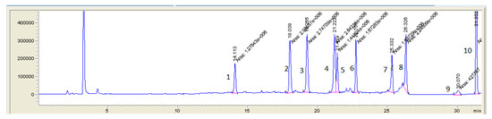 LC-MS (SIM) chromatogram of pig feces sample spiked with all analyzing antibacterial substances at first validation level (1—lincomycin 125 µg/kg; 2—trimethoprim 25 µg/kg; 3—oxytetracycline 100 µg/kg; 4—ciprofloxacin 50 µg/kg; 5—tetracycline 100 µg/kg; 6—enrofloxacin 50 µg/kg; 7—chlortetracycline 100 µg/kg; 8—doxycycline 100 µg/kg; 9—tylosin 100 µg/kg; 10—tiamulin 100 µg/kg).