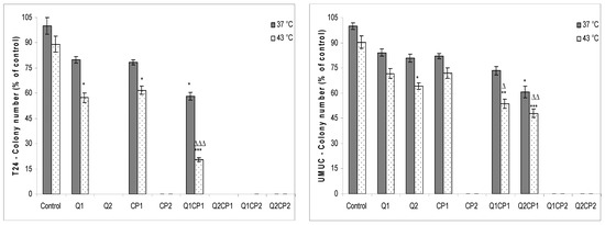 Hyperthermia in both cell lines additionally reduced the survival rate up to 10% and caused very low sensitization to CP. Again, the effect was more pronounced in T24 than UMUC cell line (Figure 1). There were no significant differences in the percentage of cell viability (MTT test) under physiological and hyperthermic conditions for T24 cells treated with QU: percentage of cell viability for Q1 was 84.9 ± 4.97% at 37 °C vs. 79.3 ± 1.55% at 43 °C (p ˃ 0.05) and for Q2 was 62.2 ± 2.87% at 37 °C compared to 57.67 ± 3.14% at 43 °C (p ˃ 0.05). Treatment with CP reduced survival of T24 cells to 76.3 ± 2.89% (CP1) or 39.5 ± 1.98% (CP2) at 37 °C, in comparison to 60.4 ± 3.22% (CP1) or 32.1 ± 1.55% (CP2) at 43 °C. The combined treatment (QU1CP2 and QU2CP2) showed a significantly higher effect in relation to control under both condition (37 °C and 43 °C; p < 0.001), Q2 (p < 0.05), but not in comparison to CP2. There was no significant difference between the different thermal conditions (37 or 43 °C) in combined treatment. Similar data were obtained for the UMUC human bladder cell line but with lower sensitivity on combined treatment and the different thermal conditions and without differences between applied concentration of QU and CP (1 or 50 µM). Apart from the results obtained with MTT assay, QU and CP showed even higher ability to reduce cell clonogenesis (Figure 2).
