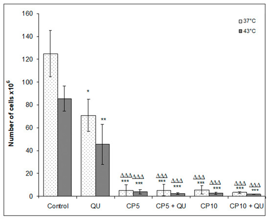 In order to verify whether the effect of the combined treatment of QU with CP at 37 or 43 °C was due to an antagonistic, additive or synergistic action, combination index values were calculated, as described in the section Materials and Methods and are presented in Table 1 and Table 2.