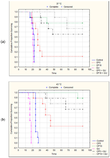 Treatment of mice with QU alone at a dose of 50 mg kg−1 reduced the number of cells in peritoneal cavity under both physiological and hyperthermic conditions (TI% was 43.27% and 64.39%), but was without the effect on the survival (Figure 4 and Table 3). The very pronounced antitumor effect was achieved after treatment with CP at doses of 5 or 10 mg kg−1 at 37 and 43 °C, and after treatment with CP in combination with QU (Figure 3, Table 3). TI% for CP5 or CP10 and its combination with QU were from 95.56 to 98.61%. In addition to significant reduction of tumor cell number compared to the control (p < 0.001), these groups also had a significant increase of lifespan (Table 3 and Figure 4).