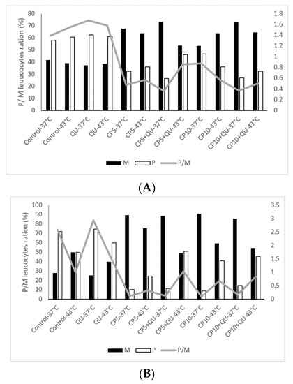 Interestingly, the number of mononuclear leukocyte cells was significantly increased in peripheral bloodstream after treatment with CP, especially at 37 °C, in relation to polymorphonuclear cells. The ratio between mononuclear and polymorphonuclear cells changed in favor of mononuclear leukocyte cells (macrophages and lymphocytes), while the treatment with QU after CP increased the number of neutrophils in the peripheral blood.