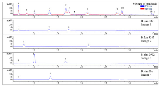 HPLC chromatograms of selected representatives of the four lineages of the B. simpliciuscula/B. kingii complex. Assignment of the compounds is according to Figure 1 and (i) unidentified MAA at 9.9 min with λmax 318 nm and m/z 294, (ii) unidentified MAA at 21.5 min with λmax 308 nm and m/z 316. The assignment of 5 as Aplysiapalythine A is tentative. Assignment of the species: B sim, B. simpliciuscula; B kin, B. kingii.