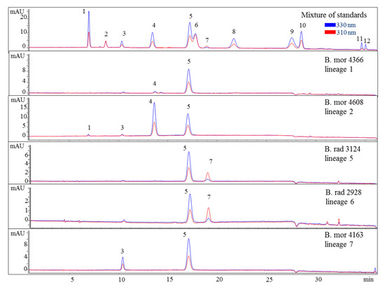 Various samples of Bostrychia spp. were analysed with the developed HPLC–DAD method. Due to the number of samples investigated only a summary of the results is shown in the main manuscript (Table 2) and all detailed results can be found in the Supplementary Material (Tables S1 and S2). As can be seen in the aforementioned tables, only eight out of 12 reference compounds could be determined in these samples since none of the samples contained compounds 8–10 and 12. Compounds 1 and 4 were the most frequently occurring compounds, although compound 1 was mostly present in minor concentration (lower than 0.15 mg per g of dry material). Compound 2 was only found in B. arbuscula and B. tenella samples, and compound 11 was only found in B. tenella samples. Compound 6 was the main MAA in B. flagellifera and samples of lineage 2 and 3 of B. calliptera, although this compound was often present in higher concentrations in the latter, which also contained compound 4 in lower amounts. B. flagellifera sometimes produced an unknown compound absorbing at 320 nm and eluting at 7.6 min in a small concentration, too. Samples of lineage 1 of the B. simpliciuscula/B. kingii complex and B. harveyi samples produced compounds 4 and 6 in medium (concentration between 0.15 and 1 mg per g of dry material) to high concentration (higher than 1 mg per g of dry material) and compound 1 in lower amount. Compound 3 was the main MAA only for lineage 3 of the B. simpliciuscula/B. kingii complex (Figure 2). Compound 5 was the only MAA found in B. vaga and the main MAA found in all samples of the B. moritziana/B. radicans complex (Figure 3).
