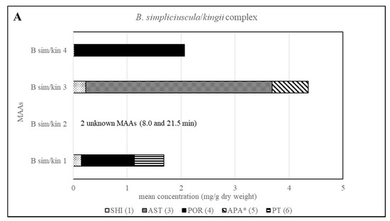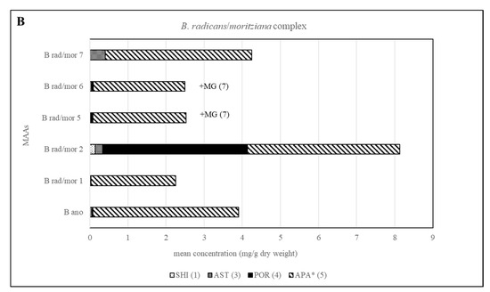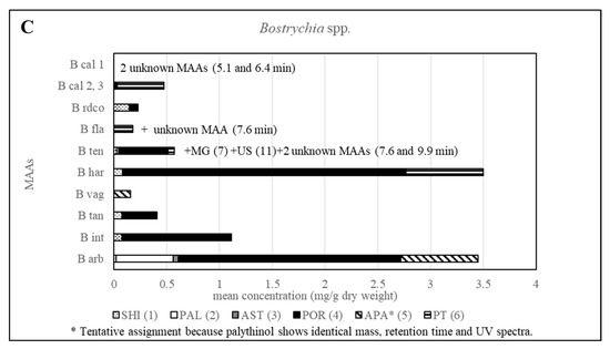 Furthermore, all other investigated Bostrychia spp. showed different MAA patterns, which in most cases were specific for each species (Figure 6 and Table S3), suggesting that MAAs can be considered as suitable biomarkers for this genus. Additionally, it was found that the generation, sex and developmental stage of the algae does not affect the production of MAAs since samples in different stages revealed identical MAA patterns. Besides, no consistent pattern was found in MAA quantity in relation to developmental stage or age of samples.