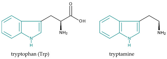Structure of tryptophan (Trp) and tryptamine with indole ring marked in teal.