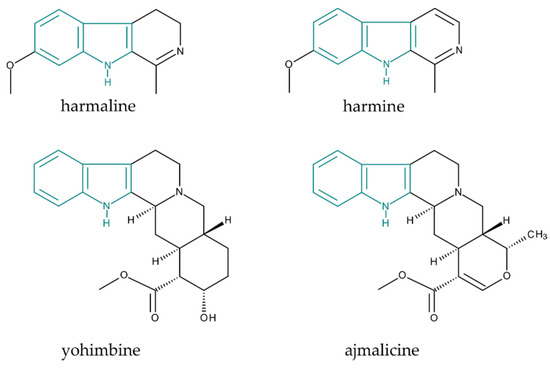 Well-known members of this group are psylocin and psilocybin, which are alkaloids isolated from species of the Psilocybe genus. The subjects of interest of this study were harmine, harmaline, yohimbine, and ajmalicine (Figure 2), which are compounds belonging to a group of terpene IAs commonly called monoterpenoid indole alkaloids (MIAs); they are formed from tryptamine and the C10 terpene unit. It is the largest family of alkaloids in the plant kingdom, consisting of over 2000 compounds of the 10,000 alkaloids identified so far [3]. Many of these natural secondary metabolites are physiologically active in mammals, and they are isolated from various medicinal plants for their specific pharmacological effects.