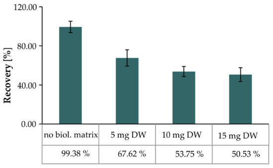 The effect of the matrix on alkaloid level was observed for harmine and yohimbine, where their amount decreased with increasing sample weight. However, for ajmalicine, the found trend was the opposite (Table 1). The recovery for stable isotopically labelled yohimbine ranged from 67.62% for the 5 mg DW of the biological sample to 50.53% for the 15 mg DW, and clearly represented the ME phenomenon (Figure 4).