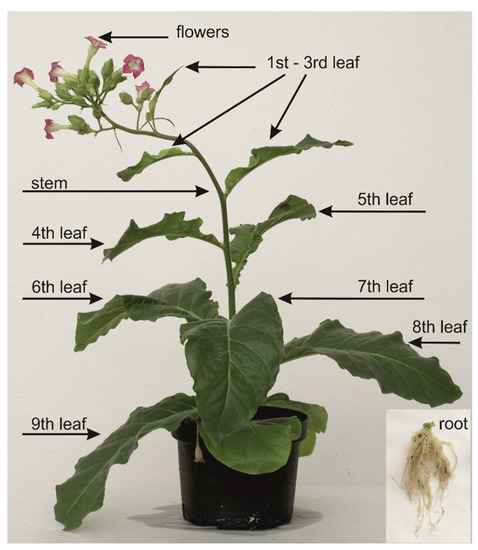 Thirty-day-old tobacco plant. Scheme of plant division into individual parts according to type and age of tissue before extraction and analysis by LC–MS/MS.