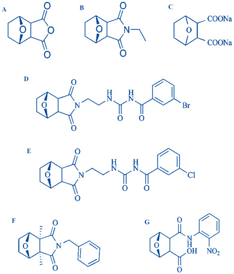 Structure of several derivatives of cantharidin (A) Norcantharidin, (B) norcantharimide, (C) sodium cantharidin, (D–F) cantharidinamides, (G) anhydride-modified derivative of cantharidin [14,27,29].