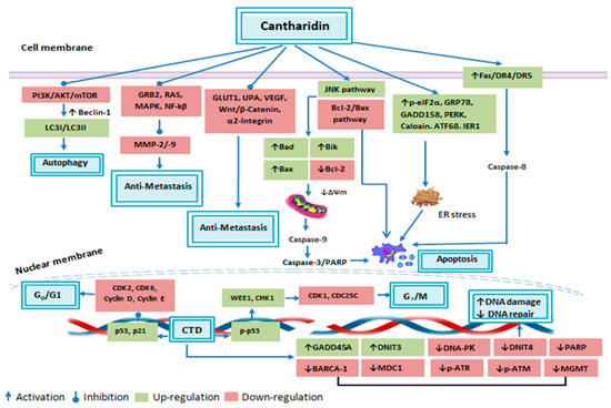 Autophagy is defined as an evolutionary conserved catabolic process that constrains cellular hemostasis through self-degrading defective or unwanted cellular organelles that are self-destroyed [87]. It depicts a significant role in multiple biologic diseases such as cancer [56]. Autophagosome formation is a characteristic feature of autophagy and microtubule-associated protein 1 light chain 3 (LC3) is a substantial autophagy associated molecule that assists autophagosome formation [88]. Beclin-1 is another important molecule in initiating autophagy, as it converts LC3-I to LC3-II [87,89]. Lately, CTD was found to instigate autophagy in A549 cells by upregulating Beclin-1 and LC3-I/LC3-II along with downregulating p62 protein expression level. This response was consorted with PI3 K/AKT/mTOR signaling pathway repression, as phosphorylated AKT, phosphorylated mTOR and phosphorylated p70-S6 K levels were greatly decreased [40]. CTD arrested cell cycle at G2/M phase in breast, lung and pancreatic carcinoma cells by autophagy associated upregulation of p21 protein. DsRed-LC3 reporter was used to confirm autophagy in these cells, which showed that there was an increase in LC3 punctate formation in CTD treated cells. In these cells, CTD caused JNK mediated CDK1 downregulation, however, p21 elevated level was independent of the JNK pathway, as pretreatment of the CTD treated cells with JNK inhibitor (SP600125) caused no effect on the p21 upregulation. Additionally, autophagy suppression by 3-Methyladenine attenuated p21 increased level. These findings indicate that CTD mediated cytotoxicity and cell cycle arrest through JNK/Sp-1 based repression of CDK1 and autophagy associated elevation of p21 [72]. Autophagy performs a dual role in cancer regulation, as its pro-survival role positively accelerates several hallmarks of cancer [87]. In triple-negative breast cancer cells, CTD was found to restrain pro-survival autophagy. This effect was accomplished via suppression of LC3-I to LC3-II conversion and autophagosome formation through Beclin-1 downregulation [53]. These findings indicate that CTD can effectively induce autophagy via modulating several autophagy associated genes as summarized in Table 1 (Figure 4).