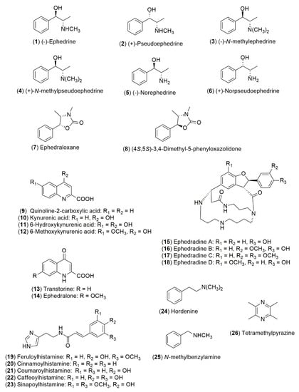 According to the Chinese and Japanese pharmacopoeias, the crude drug Ephedra Herb (Mahuang), also is known as “mao”, consists of the dried herbaceous stem from E. sinica Stapf, E. intermedia Schrenk & C.A.Mey., and E. equisetina Bunge [], while the crude drug known as “mao-kon” consists of the roots of Ephedra species []. The wide range of pharmacological activities showed by Ephedra species are related to the content of ephedrine-type alkaloids 1–6 (Figure 1). Ephedrine (1) occurs as the main alkaloid accumulated in E. sinica Stapf while in E. intermedia Schrenk & C.A.Mey. and E. lomatolepis Schrenk the major alkaloid is (+)-pseudoephedrine (2) []. A bio-guided study of the MeOH soluble extract of E. intermedia Schrenk & C.A.Mey. was conducted to isolate ephedraloxane (7) and its semisynthetic analog 8 as the entities responsible for the anti-inflammatory effect observed in the plant []. Quinoline alkaloids are also produced by Ephedra species (Figure 1); 6-hydroxykynurenic acid (11) occurs as the major alkaloid in E. foeminea Forssk. and E. foliata Boiss. ex C.A.Mey. This compound together with kynurenic acid (10) and 6-methoxykynurenic (12) acid were isolated from E. pachyclada Boiss []. Transtorine (13), a 4-quinolone containing a 2-carboxylic acid moiety, was isolated from E. transitoria Riedl [] while ephedralone (14) a 7-methoxylated analog of 13 was isolated from E. alata Decne []. From the “mao-kon” crude drug, macrocyclic spermine alkaloids (Figure 1) were isolated, represented by ephedradines A–D (15–18) [,,] that possess hypotensive activity in animal models []. In addition, the imidazole alkaloid feruloylhistamine (19) was also isolated as a hypotensive principle from “mao-kon” [] and the semisynthetic derivatives 20–23 were assayed like the natural product precursor []. From aerial parts of E. aphylla Forssk. it was isolated ephedradine C (17) and hordenine (24) []. The alkaloids, N-methylbenzylamine (25) and tetramethylpyrazine (26) were described in E. sinica Stapf []. It is worth noting that American Ephedra species are considered to lack ephedrine-type alkaloids 1–6, even though there are three reports mentioning that these species contain (−)-ephedrine (1), this fact remains unclear [,].