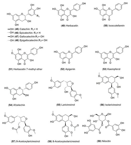 The latter compound was also reported from E. lomatolepis Schrenk [] and compound 74 from E. equisetina Bunge []. Thereafter, Hussein et al. reported the isolation and structure elucidation of 2″,2″-di-O-β-glucopyranosylvicenin 2 (67) and herbacetin 3-O-α-rhamnopyranoside 8-O-β-gluco-pyranoside (65). Additionally, the compounds p-hydroxybenzoic (28), p-coumaric (33) protocatechuic (30) and herbacetin 7-methyl ether (51) were also isolated and characterized from the aqueous ethanolic extract of the aerial parts of E. aphylla Forssk. []. Several flavones, flavanols and phenolic acids derivatives have been reported such as apigenin (52), lucenin 1 (70) and lucenin 3 (71) from E. antisyphilitica Berland. ex C.A.Mey.; (+)-catechin (45) and gallocatechin (47) from E. distachya subsp. helvetica (C.A.Mey.) Asch. & Graebn. (Syn. E. helvetica); ephedrannin A (98) and distachic acid (31) from E. sinica Satpf and E. distachya L., respectively [,]; as well as nilocitin (59) from E. alata Decne []. In addition, molecular biology methodologies for the quality control of Ephedra species have been developed due to the high number of people consuming products prepared from these plants. In this context, a fingerprint method contributed to the isolation of two derivatives of benzoic acids, 34 and 35 from E. sinica Stapf []. A MeOH-soluble extract from the aerial parts of E. major Host (Syn. E. nebrodensis) was studied for the understanding of its chemical composition, its cytotoxicity and its antiviral activity. Thus, nebrodensides A (44) and B (36), as well as the o-coumaric acid glucoside (37) and (−)-epicatechin (46) were isolated []. Pullela et al. reported the phytochemical constituents and biological activity of E. viridis Coville. In this study they were identified and isolated four compounds: lariciresinol (55), isolariciresinol (56), 9-acetoxylariciresinol (57) and 9-acetoxyisolariciresinol (58); which were evaluated for their antioxidant activity and cytotoxicity against a panel of solid tumors and human leukemia cells, showing moderate activity []. Other investigations have reported the isolation, structure elucidation, and cytotoxicity evaluation of dimeric proanthocyanidins from the roots of E. sinica Stapf. Ephedrannin A (98), ephedrannin B (99), mahuannin D (95) and mahuannin E (96) were evaluated, finding that only ephedrannin B (99) was significantly active []. Mahuannins A (92), B (93), C (94) and D (95) have also been described as hypotensive compounds [,]. The phytochemical investigation of the EtOH extract from E. sinica Stapf led to the isolation of the A-type proanthocyanidins: ephedrannins D1-D7 (81, 87, 83, 84, 88, 82 and 85, respectively), ephedrannins Te1-Te5 (77–80, and 76, respectively), ephedrannins Tr1 (90) and Tr2 (91); and the evaluation of their antimicrobial activities. (+)-Epigallocatechin-(2α→O→7,4α→8)-(+)-catechin (86), proanthocyanidin A4 (89), (+)-catechin (45), (−)-epicatechin (46), gallocatechin (47) and epigallocatechin (48) also have been previously described in the plant []. Syringin (38), symplocoside (62), pollenitin B (68), herbacetin 7-O-glucoside (63), kaempferol-3-O-rhamnoside 7-O-glucoside (61), isovitexin 2-O-rhamnoside (64) and the flavonoid glycoside known as herbacetin 7-O-neohesperidoside (60) were obtained from the commercial Ephedra herb extract marketed from Tsumura & Co. []. Recently, it has been discovered that herbacetin (49) and their glycosides (63, 65, 69 and 75) inhibit hepatocyte growth factor-c-Met-Akt signaling. The effects of herbacetin (49) were compared to those described for apigenin (52), kaempferol (53), and isoscutellarein (50), all of which have similar structures and suggest that herbacetin (49) has potential utility in cancer therapeutics [].