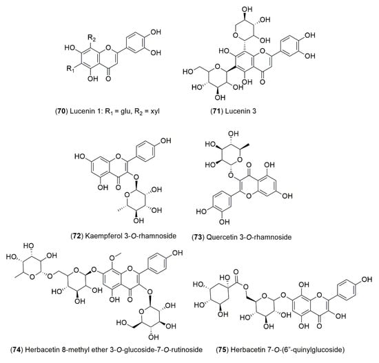 As previously mentioned, according to the Chinese and Japanese pharmacopoeias, the crude drug Ephedra Herb (Ma Huang), consists of the dried herbaceous stems from E. sinica Stapf, E. intermedia Schrenk & C.A.Mey., and E. equisetina Bunge []. The standardization of crude drugs and plant extracts is based on the marker constituent quantification, due to the fact that the determination of the amount of every constituent in a multicomponent system is impossible. For this reason, the quantitative analyses of herbacetin (49) as a marker in the ephedrine alkaloids-free (EFE) extracts and preparations for clinical use, as part of the control quality tools, has been proposed []. Likewise, several EFE extracts from plants grown in different habitats and collected over a 12 year period of time were analyzed trough liquid chromatography coupled to high resolution mass spectrometry (LC/HRMS), showing two common notable corresponding to the flavone C-glycosides: vicenin 2 (66) and isovitexin 2″-O-rhamnoside (64). Therefore, they then served as quantitative markers for the quality control of the manufacturing process of the extract [].