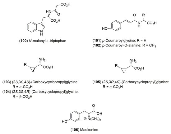 The amino acid derivatives were isolated from a suspension culture of E. distachya L. (Figure 3) N-malonyl-l-tryptophan (100), p-coumaroylglycine (101) and p-coumaroyl-D-alanine (102) []. Furthermore, from an acidified ethanolic extract of the seeds of E. altissima Desf., the non-protein amino acid (2S,3S,4S)-(carboxycyclopropyl)glycine (103) and the diastereomers 104 and 105 where obtained. Maokonine (106), an L-tyrosine betaine was isolated as an active hypertensive principle from a MeOH-soluble extract of the crude drug “radix Ephedrae” [].