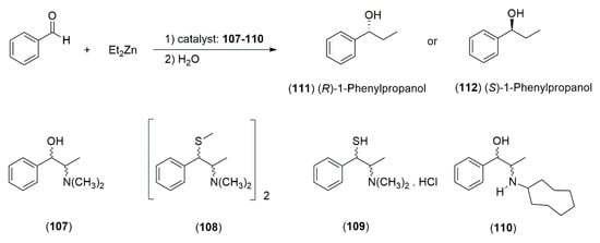 The Ephedra alkaloids, due to their chemical and structural characteristics, have been used as templates or scaffolds to generate a variety of chiral ligands useful for transferring asymmetry in the catalytic asymmetric addition of diorganozinc reagents to carbonyl compounds (aldehydes and ketones) []. For this reason, many investigations have been concerned with the careful design and synthesis of chiral ligands that possess the ability to effectively transfer asymmetry. These studies have led to the creation of a wide range of these structurally diverse ligands capable of inducing very high enantioselectivity in asymmetric alkylation reactions []. Thiol and disulfide derivatives of ephedrine 107, 108 and 109 have been shown to catalyze with high enantiomeric excess (ee) the reaction of diethylzinc with benzaldehyde to obtain (R)-1-phenylpropanol 111 (Figure 4). Fitzpatrick et al. observed that the reaction involves non-linear correlations between the ee of product and catalyst []. The β-aminoalcohols derived from the Ephedra alkaloids also have a large a widespread use in this field. Parrott et al. examined the scope and utility of mono-N-alkylated Ephedra derivatives in the catalytic enantioselective addition of diethylzinc to aldehydes, founding that the absolute configuration of the addition product was directed by the benzylic position of the Ephedra alkaloid, while the magnitude of the enantiomeric ratio was heavily influenced by the nitrogen substituent. Among the ligands that were prepared, it was determined that the N-cyclooctylpseudonorephedrine derivative 110 yielded the highest enantiomeric ratios (87.5:12.5 to 91.0:9.0) to obtain (S)-1-phenylpropanol 112 (Figure 4), []. Dean et al. described the impact of oxygenated side chains in Ephedra compounds on the catalytic asymmetric addition of diethylzinc to aldehydes. They synthesized derivatives ligands from (−)-ephedrine (1) and (+)-pseudoephedrine (2), having a variety of N-β-alkyoxyalkyl and N-alkyl side chains (Figure 5). It was determined that when the ephedrine-derived ligands 113a–h were used in an asymmetric 1,2-addition of diethylzinc to benzaldehyde, the (R) configuration of the product was obtained; whereas when the pseudoephedrine derived ligands 114a–h were used in the same process, the (S)-configuration of the product was afforded. The opposite configurations observed in the products are believed to be due to changes in configuration at the benzylic position [].