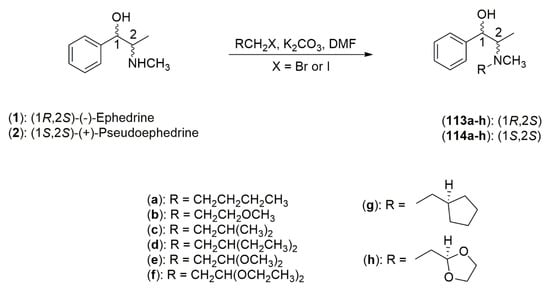 Synthesis of N-alkyl and N-β-alkoxyalkyl Ephedra ligands 113a–h and 114a–h.