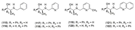 The application of the methoxyethyl side chain of 113b in the addition reaction afforded lower enantioselectivities (66:34, R:S) and the application of the acetal bearing side chains of 113e and 113h yielded enantioselectivities comparable to their non-oxygenated side chain analogs (90:10 and 91:9, R:S, respectively). This work proposed that the presence of oxygen could have a negative effect in terms of enantiomeric discrimination, but this effect is diminished with higher levels of substitution near to the same oxygen []. In another study, the N-pyridylmethyl-substituted Ephedra derivatives were synthesized. Both (−)-norephedrine (5) and (+)-norpseudoephedrine (6) were reductively alkylated by the reaction with either benzaldehyde, pyridine-2-carboxaldehyde, 5-methylpyridine carboxaldehdye, or quinoline-2-carboxaldehyde followed by treatment with NaBH4 to afford derivatives 115–122 (Figure 6).